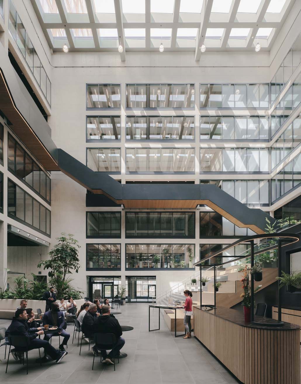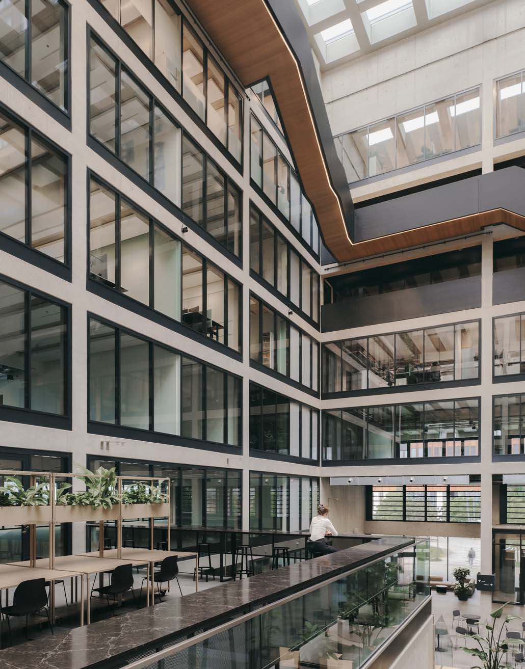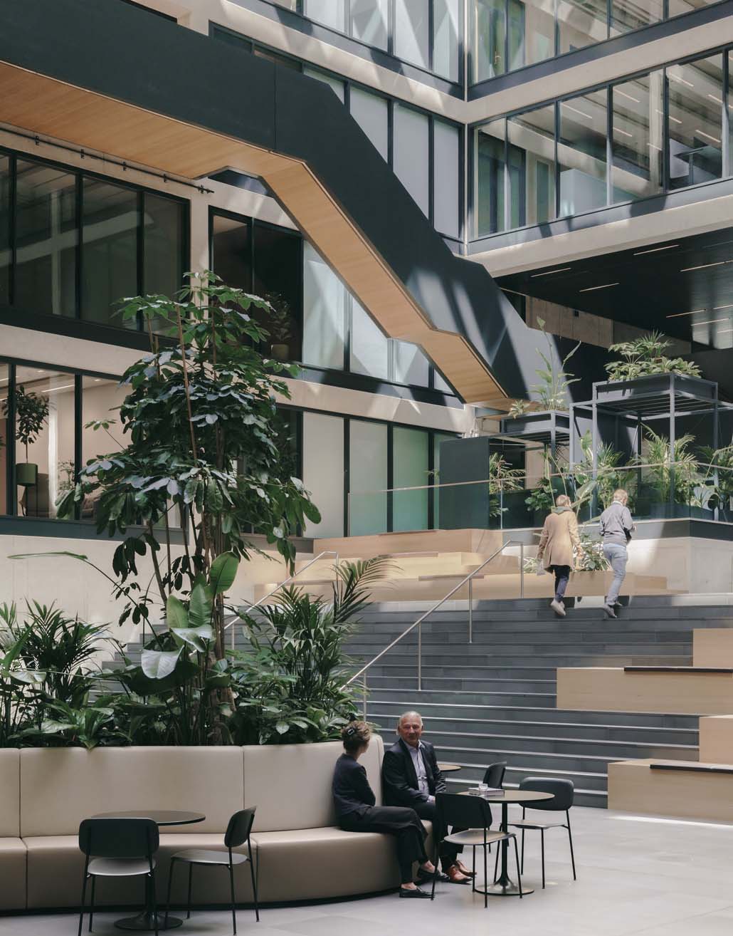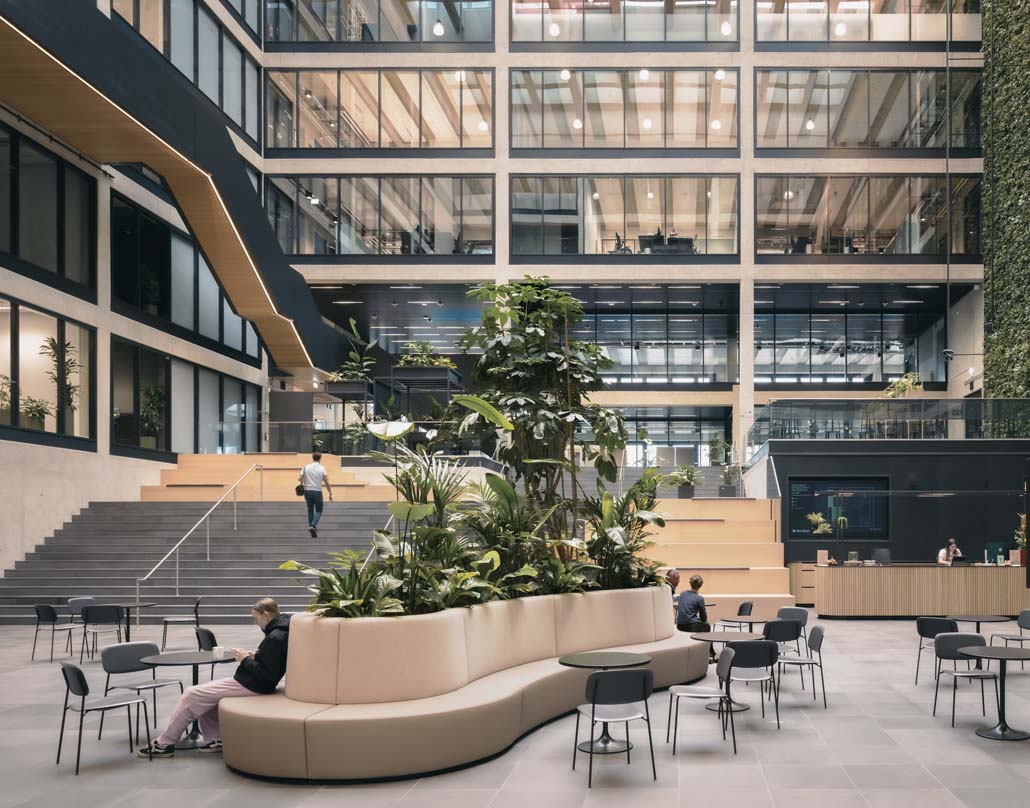 Über das Atrium und die großformatigen Fenster fällt reichlich Tageslicht in die Innenräume. Es sorgt gemeinsam mit Pflanzen, natürlichen Materialien und vernetzten digitalen Technologien für eine komfortable Atmosphäre – zum Arbeiten und für ein soziales Miteinander.