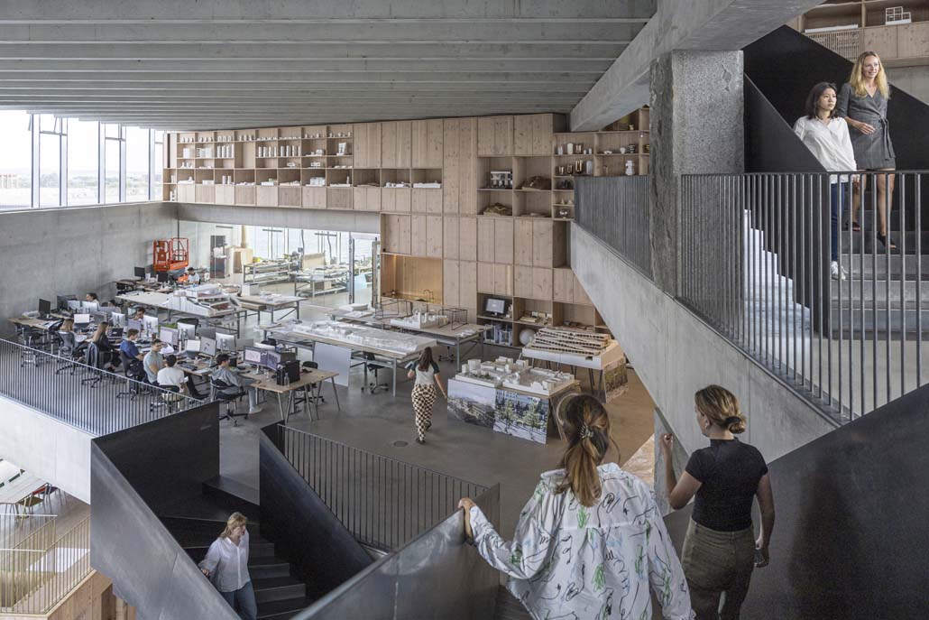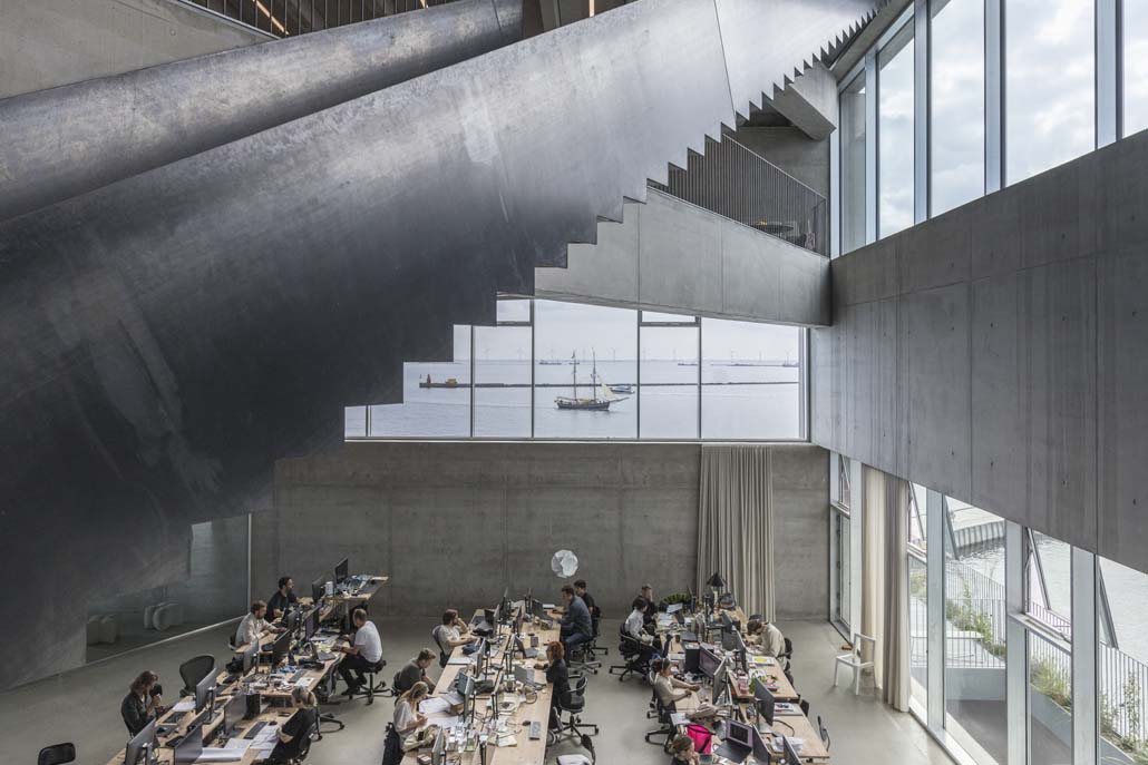 Beim Betreten des Haupteingangs durch eine drei Meter hohe Glastür finden sich BIGsters und Gäste in einem piranesischen Raum wieder, in dem sich das Innenleben des Gebäudes durch diagonale Ausblicke bis hinauf in die oberste Etage offenbart, angeführt von einer zentralen Treppe aus geschwärztem Stahl, die im Zickzack verläuft und alle sieben Stockwerke sowohl visuell als auch physisch miteinander verbindet.