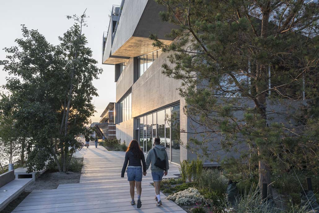 Entlang der Außentreppe, die den Hauptsitz umgibt, wurden windtolerante Baumarten, Sträucher, Stauden und Kräuter gepflanzt, deren Kräuter von den Köchen in der Kantine des Studios verwendet werden. Die Dachterrasse, die mit Holz aus einem örtlichen Sägewerk gepflastert ist, setzt das Thema des Parks mit natürlichen Materialien fort, um eine ganzheitliche Verbindung zwischen Stadtraum und Architektur zu schaffen und Mitarbeitern und Gästen einen einzigartigen Blick auf die Stadt und das Wasser zu bieten.