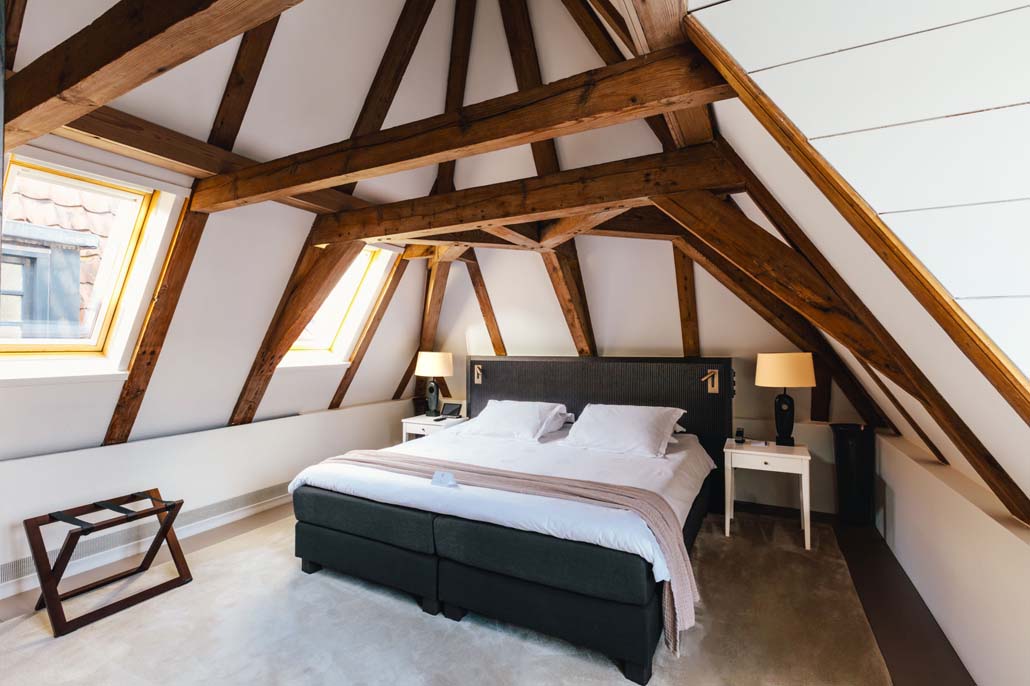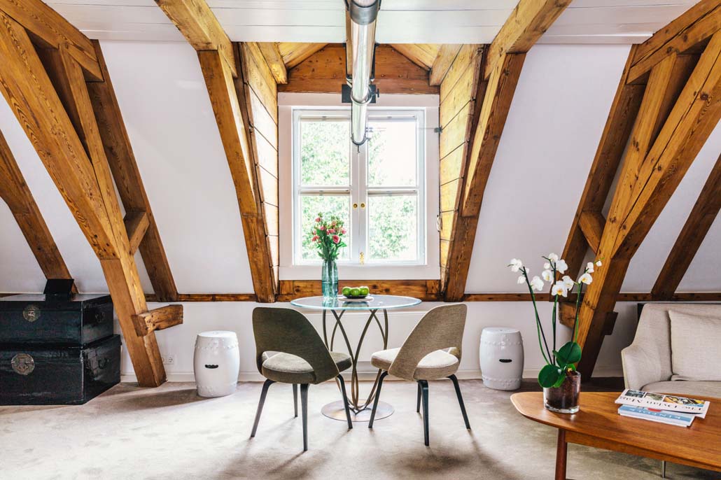 Die Raumgestaltung des The Dylan ist geprägt durch ein gekonntes Zusammenspiel aus historischer Substanz und modernem Minimalismus. Im „Occo“ beispielsweise finden sich maßgeschneiderte Samtsofas und Quarzit-Tische mit subtilen Texturen. Der begrünte Innenhof wird zudem in den üppigen Spiegelflächen reflektiert, was dem Saal Helligkeit und Weite verleiht. Im Restaurant „Vinkeles“ wiederum verweist ein grauer Samtvorhang auf das berühmte Theater, das hier einmal stand. Dieselbe Liebe zum Detail steckt auch in den Zimmern und Suiten. Zu den Markantesten gehören dabei die Lofts im Dachgiebel des historischen Gebäudes: Mit ihren steilen Treppen und spitzen Winkeln sind sie typisch für die Architektur ihrer Zeit, wobei vor allem die Holzbalken aus dem 17. Jahrhundert das Baualter verdeutlichen. Ergänzt werden sie von einer minimalistischen Möblierung in Beige und Schwarz, die ein warmes, intimes Ambiente schafft.