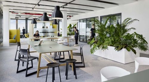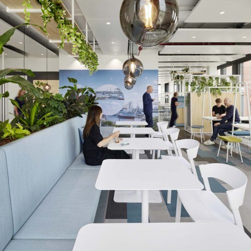Basierend auf Nutzer-Workshops mit den Mitarbeitenden wurden das Raumkonzept und die Gestaltung der Teambereiche entwickelt, mit maßgefertigten Arbeitswelten in wechselnden Atmosphären und Nutzungskonstellationen. Da es sich im Gesamten um ein non-territoriales Arbeitsplatzkonzept handelt, sind alle Mitarbeitenden frei in der Platzwahl innerhalb des Gebäudes.