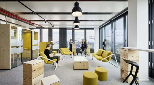 Das 15. OG mit bestem Ausblick auf die umgebende Hafencity ist als „Kreativ-Etage“ gestaltet, deren offene Co-Working-Bereiche und flexibel ausgestattete Projekträume für alle Mitarbeitenden von Vattenfall nutzbar sind.