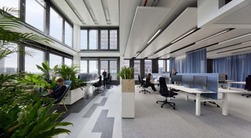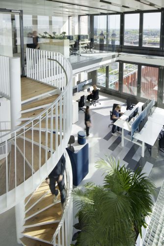 In den Turmgeschossen 7 bis 9 entstanden offene Arbeitsbereiche mit Meetingräumen und Teamküchen bzw. Coffee Points. Die 2-geschossigen Atrien erweitern das Nutzungsangebot, fördern die Kommunikation und verbinden zum Teil über eine zusätzliche interne Treppe die Teambereiche und Funktionen miteinander.