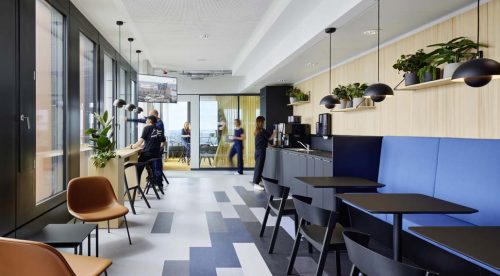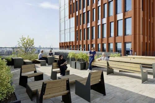 Ein besonderes Highlight ist die Skylounge im 6. OG mit einem gastronomischen Angebot sowie Zugang zur exklusiv von Vattenfall genutzten Dachterrasse. Durch die Anordnung verschiedener Möbelgruppen sowie durch die Begrünung entstehen hier unterschiedliche Aufenthaltsqualitäten. Die Dachterrassenfläche kann außerhalb der regulären Bürozeiten als Veranstaltungsfläche für bis zu 300 Personen genutzt werden.
