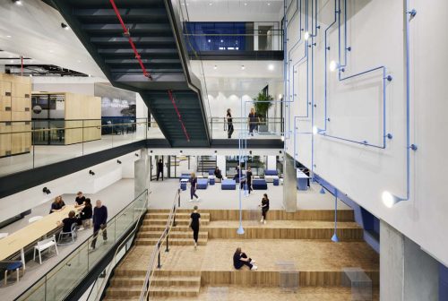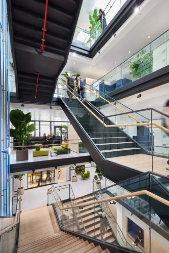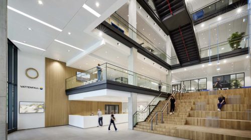 Im Erdgeschoss entstand neben der Empfangszone eine bis ins Mezzanin reichende halböffentliche Treppenlandschaft, die auch für Veranstaltungen genutzt werden kann. Ergänzt wird das Raumprogramm im Erdgeschoss durch einen Sportbereich und einen großen Fahrradraum mit integrierter Werkstatt und Lademöglichkeiten für E-Bikes. Die Galerie im Mezzaningeschoss oberhalb des Empfangstresens ist als offener Co-Working-Bereich konzipiert. Die angrenzenden Meetingräume werden exklusiv von Vattenfall genutzt. Die Konferenzzone im 1.OG verfügt über eine eigene Küche und Coffee Bar und bietet vier kleinere, multimedial voll ausgestattete Konferenzräume sowie zwei große, zusammenschaltbare Konferenzräume mit Platz für insgesamt bis zu 100 Personen.