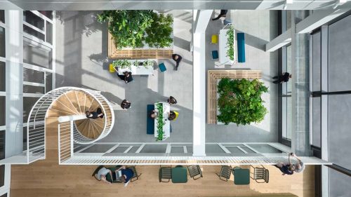 Das kommunikative Flächenlayout basiert auf der Grundidee eines „Straßendorfes“. Die Raumaufteilung und Anordnung der Arbeitsbereiche erfolgt entlang der sogenannten Magistrale, um welche sich die verschiedenen Funktionen gruppieren. Das Konzept der Bürolandschaft wurde für die Regelgeschosse im Sockel entwickelt und auf alle Ebenen des Gebäudes übertragen. Als offener, orientierungsgebender Bereich dient die Magistrale in den Sockelgeschossen als Haupterschließungsachse von Nord nach Süd und verbindet die verschiedenen Teambereiche und Raumnutzungen miteinander. Dabei erfolgt die Verbindung zum einen innerhalb der Geschossebene und zum anderen auch vertikal zwischen den Sockelgeschossen über eine großzügige, offene Treppenanlage. Entlang der Magistrale sind jeweils zwei geräumige Teamküchen-Bereiche angeordnet, ergänzt durch verschiedene Konfigurationen aus Meetingräumen, Raum-in-Raum-Modulen, Kreativzonen, Projekträumen sowie Serviceflächen. Die sich anschließenden, offen gestalteten Arbeitsbereiche sind durch eingestellte Rückzugsräume zum Teil weiter untergliedert. Eine gebäudespezifische Besonderheit stellen die mehrgeschossigen Wintergärten und Atrien dar, welche mit unterschiedlichen Möblierungen zusätzliche Nutzungsmöglichkeiten für Erholung, Rückzug oder informelle Meetings anbieten.