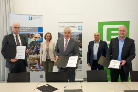 Koblenz (pm) – Die Vertragsunterzeichnung fand auf dem Rhein-Mosel-Campus der Hochschule in Koblenz statt. Im Oberlichtsaal setzten der Geschäftsführer des Landesbetriebs LBB, Holger Basten, und die Geschäftsführer des Contractors E1 Energiemanagement GmbH aus Nürnberg, Richard Kerl und Ralf Schrauder, ihre Unterschriften unter das Vertragswerk. Hochschulpräsident Prof. Dr. Karl Stoffel dokumentierte mit seiner Unterschrift die Kenntnisnahme der Hochschule als dritter Projektbeteiligter. Der Vertrag kam mit Unterstützung der Deutschen Energie-Agentur (dena) zustande, die im Rahmen ihres Programms „CO2ntracting: Build the future!“ Bundesländer und Kommunen beim ESC-Contracting berät.