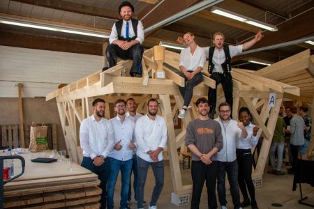 Bei der Bewertung der beiden Arbeiten musste die Jury eine ganze Reihe von Punkten beachten. Neben der Einhaltung der Vorgaben bezüglich der Außenmaße und Höhe wurden zum Beispiel auch die Tragwerksplanung, der konstruktive Holzschutz und die Konzeption von Bauteilvorfertigung, Transport und Montage bewertet. „Die Studierenden haben ein konkretes Projekt komplett selbstständig erarbeitet. Durch die Arbeit in den verschiedenen Disziplinen können sie bei späteren Projekten viel sensibler mit Architekt:innen und Designer:innen zusammenarbeiten. Diese Soft Skills sind unglaublich wertvoll“, erklärte Prof. Peterson. Prof. Dr. Christof Schelthoff, Prorektor für Strategische Planung, Finanzierung und Steuerung der FH Aachen, sagte den Studierenden beider Teams eine rosige Zukunft voraus. „Nachhaltigkeit ist ein sehr wichtiges Thema, das uns als FH Aachen sehr am Herzen liegt. Und Sie arbeiten mit Holz, einem der nachhaltigsten Rohstoffe. Das fördern wir natürlich sehr gerne. Ich wünsche Ihnen alles Gute für Ihre Zukunft.“ Der stellvertretende Bürgermeister der Gemeinde Simmerath, Helmut Kaulard, lobte die Verbindung zwischen der Handwerkskammer Aachen, dem BGZ und der FH Aachen. Marco Theissen, Leiter des BGZ Simmerath und Fachbereichsleiter Eifelcampus, wünscht sich sogar eine Fortführung der Partnerschaft mit der FH Aachen: „Wir würden uns freuen, wenn wir dieses Projekt auch in Zukunft weiterhin gemeinsam durchführen können“. Alle drei waren Mitglieder der insgesamt neunköpfigen Jury.