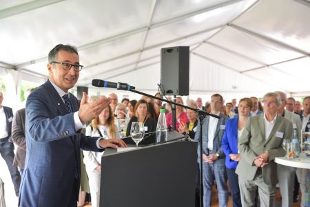 Stuttgart (pm) – Größere Geschlossenheit aller demokratischen Parteien forderte Cem Özdemir, Bundesminister für Ernährung und Landwirtschaft, am 1. Juli beim Sommerlichen Empfang der Architektenkammer Baden-Württemberg ein. Mehr als 500 Gäste kamen im Panoramagarten des Hauses der Architektinnen und Architekten zusammen, um den diesjährigen Gastredner zu hören. Özdemir nutzte seinen Auftritt vor Vertreterinnen und Vertretern der Branchenverbände, der Wirtschaft sowie der Landes- und Kommunalpolitik, sich scharf von den extremen politischen Rändern abzugrenzen: „Bei allem Streit sind die Unterschiede, die wir untereinander haben, immer kleiner als die Unterschiede, die wir gemeinsam gegenüber denjenigen haben, die unser wunderbares Land kaputt machen wollen. Wenn wir einig sind, schaden wir denen mehr als alles andere“, sagte Özdemir unter großem Beifall. Es sei etwas „verrutscht in diesem Land“. Ein schlichtes Weiter-so reiche nicht mehr.