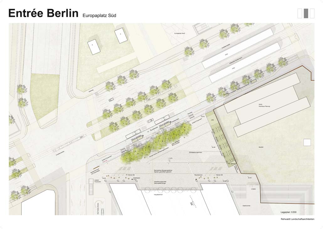Der Entwurf orientiert sich grundsätzlich am städtebaulichen Raum und arbeitet konzeptionell wie auch im Detail mit dem Spiel der unterschiedlichen Richtungen. Ziel der Verfasserinnen und Verfasser ist es, eine möglichst großzügige, offene Platzfläche auszuformen, die den ankommenden Reisenden ein freundliches Willkommen bietet. Unter dem Leitbild „Entrée Berlin“ soll ein urbaner, einladender Platzraum in der Mitte der Stadt entstehen, der eine gute Orientierung und atmosphärische Aufenthaltsorte bieten soll.