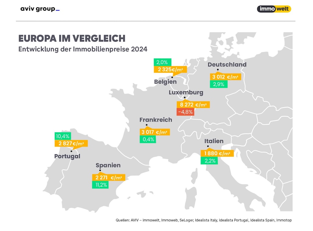 Auf der iberischen Halbinsel legten die Angebotspreise hingegen deutlich zu: In Spanien verteuerten sich Wohnimmobilien binnen eines Jahres um durchschnittlich 11,2 Prozent auf 2.271 Euro pro Quadratmeter. Portugal verzeichnete 2024 ein Plus von 10,4 Prozent auf 2.827 Euro.