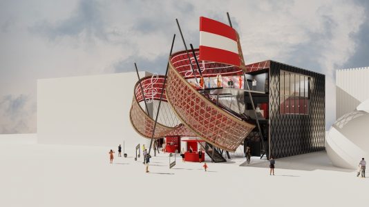 Im Mittelpunkt steht eine spektakuläre Spiralskulptur, die majestätisch in die Luft ragt und weithin sichtbar ist. Bei genauer Betrachtung enthüllt sich ein überdimensionales Notenband, das aus miteinander verschraubten Holzlamellen besteht, wie Johann Moser, Architekt des Österreich-Pavillons, erklärt.
