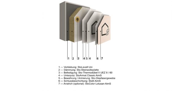 StoTherm AimS ist ein nichtbrennbares Fassadendämmsystem. Es besteht aus dem Unterputz StoArmat Classic AimS, dem Oberputz Stolit AimS und kann mit der Fassadenfarbe StoColor