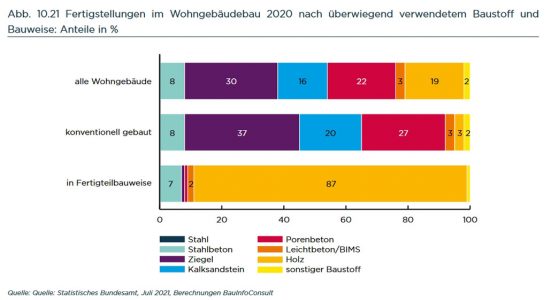 Die statistischen Daten für 2020 belegen, dass Holz der dominante Wandbaustoff ist, wenn es um den Einsatz von industriell vorgefertigten Bauteilen im Wohnungsbausegment geht. So wurden 2020 in neun von zehn errichteten Fertighäusern Holz als überwiegend verwendeter Wandbaustoff benutzt. Andere Baustoffe spielen so gut wie keine Rolle in diesem Segment.