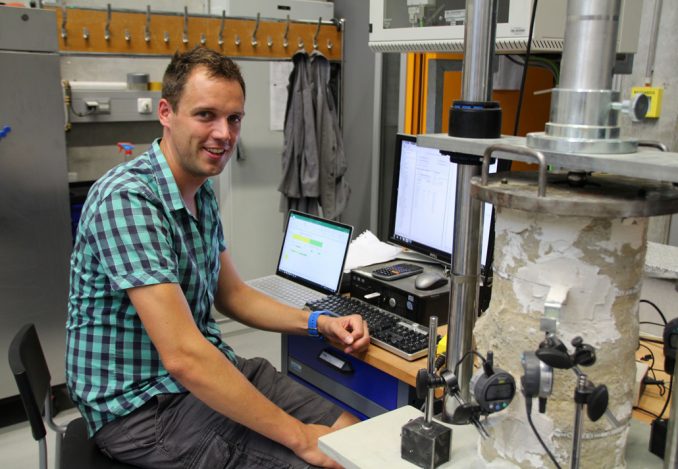 Roland Gömmel erarbeitet in seiner Promotion an der OTH Regensburg Standsicherheitsnachweise unter Berücksichtigung der Wirkungsweise von Stabilisierungssäulen. Hier testet er gerade das Elastizitätsmodul einer Säule mittels einer Prüfpresse. Foto: Diana Feuerer, OTH Regensburg