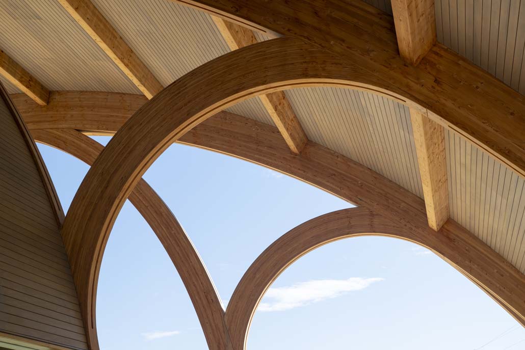 Ein sanfter Weg führt zum neuen Besucherzentrum, dem Hauptprotagonisten des Projekts. Es ist als gewölbte und stützenfreie Halle konzipiert, um ein großzügiges und flexibles Volumen zu schaffen. Das gewölbte Dach ist vom industriellen Erbe der Weinkellerei inspiriert und wurde als leichte Struktur aus Holzbögen neu interpretiert. Das antifunikale Profil verbessert die strukturelle Leistung bei minimalem Materialeinsatz, während die erdige Farbpalette das Gebäude nahtlos mit der Landschaft verschmelzen lässt. Ein asymmetrischer Kern verbindet sich mit dem darüber liegenden Zwischengeschoss, während auf der unteren Ebene zwei unterschiedliche Zonen mit jeweils unterschiedlichem Charakter entstehen. Von der oberen Ebene aus überblickt man das gesamte Besucherzentrum und die wunderschöne Weinbergslandschaft dahinter.