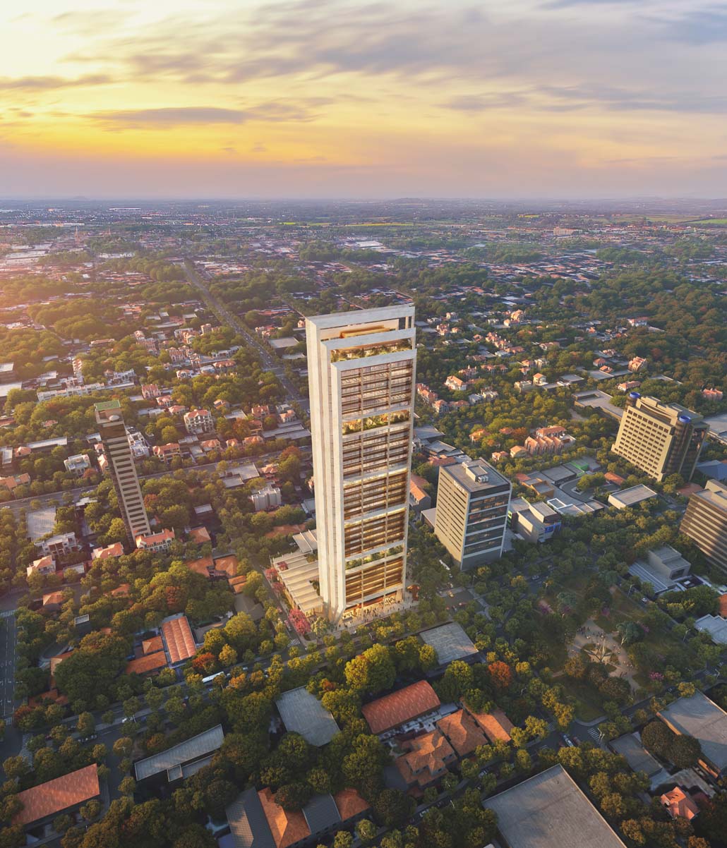 Sudameris wird die ersten sechs Etagen sowie die beiden obersten Geschosse des Turms nutzen. Die dazwischenliegenden Etagen werden als Büroflächen vermietet. Jede Etage umfasst 1.200 Quadratmeter – besonders große, zwölf Meter tiefe Grundrisse auf der Nordseite ermöglichen flexible, offene Arbeitsbereiche. Diese doppel- und dreifachhohen Räume öffnen sich zu begrünten Außenterrassen, auf denen sich Mitarbeitende entspannen und austauschen können. Auf der Südseite bieten offene Begegnungszonen mit Blick auf den neuen Garten weitere ruhige Verbindungen zur Natur im Inneren des Turms. Die beiden obersten Etagen beherbergen exklusive Büros, einen Vorstandssaal und eine private Galerie – mit Panoramablick über die Stadt von großzügigen Terrassen.