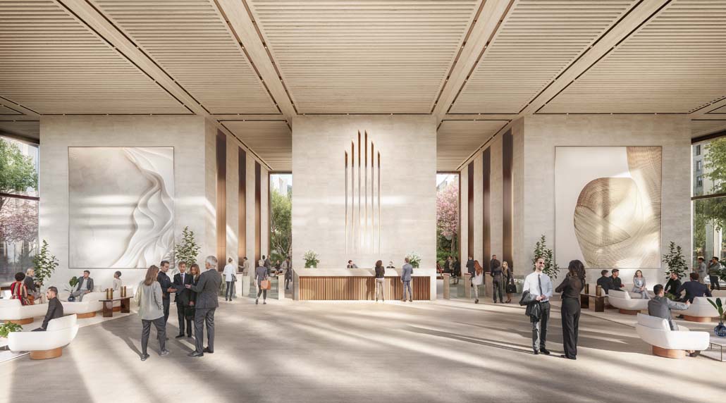 Ein großzügiges, doppelt hohes Foyer heißt Mitarbeiter:innen und Besucher:innen im Gebäude willkommen. Es ist von der Straße zurückgesetzt und schafft so einen überdachten Rundweg um das Gebäude, der in einen lebendigen öffentlichen Garten im Zentrum des Areals führt. Dieser neue Grünraum wird von niedrigen Gebäuden mit Geschäften, Cafés und kulturellen Einrichtungen gesäumt, die das Erdgeschoss beleben und Besucher:innen in das Areal ziehen. Alle Bäume auf dem Grundstück werden entweder erhalten oder in einen angrenzenden öffentlichen Platz versetzt – so entsteht eine grüne und ruhige Umgebung für die Allgemeinheit.