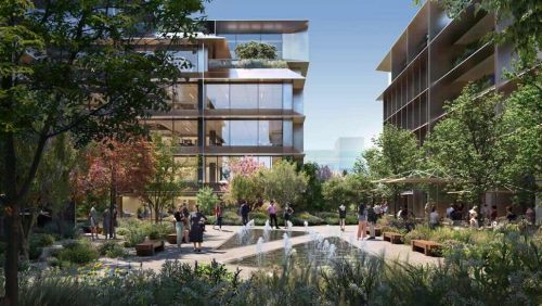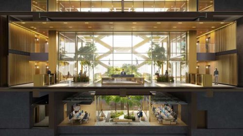 Die reiche Mischung aus flexiblen Arbeitsbereichen und Annehmlichkeiten erfüllt die unterschiedlichen Bedürfnisse der Nutzer. Die Atrien reichen bis ins Untergeschoss und lassen Licht und Luft in die Büros in den unteren Etagen des Gebäudes. Oberlichter entlang der Ostfassade lassen Licht in die Turnhalle eindringen und beleben das Untergeschoss. Jede Büroetage hat Zugang zu begrünten Außenterrassen, die sich über die Innenseiten erstrecken und die Größe des Gebäudes vom Innenhof aus reduzieren.