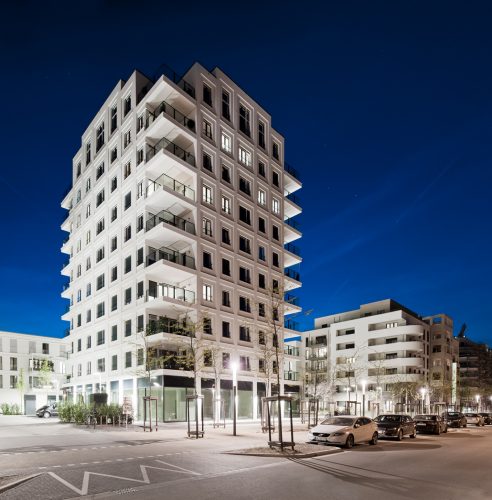 KATEGORIE „ARCHITECTURE“ Winner: Le Flair, Baufeld 6, Düsseldorf. Der 800 m lange Boulevard des neuen Viertels Le Flair wird durch den „Quartiersplatz“ geprägt, der sich durch ein zehngeschossiges Punktgebäude optisch als Zentrum hervorhebt. Foto: Interboden