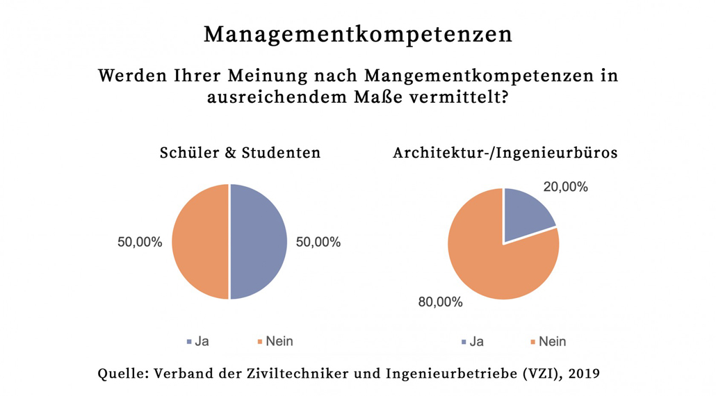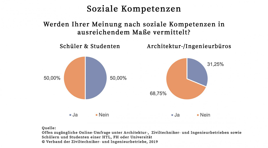 So zeigen die Umfrageergebnisse unter 39 österreichischen Architektur- und Ingenieurbüros sowie 186 Schülern und Studenten technischer Fachhochschulen, Höherer Technischer Lehranstalten und Universitäten, dass soziale Kompetenzen, wie etwa die Fähigkeit, im Team zu arbeiten, zwar in der Praxis zunehmend an Bedeutung gewinnen, jedoch für jeden zweiten Auszubildenden und in etwa zwei Drittel der Arbeitgeber derzeit nicht in ausreichendem Maße an technisch höheren Schulen, Fachhochschulen und Universitäten vermittelt werden.