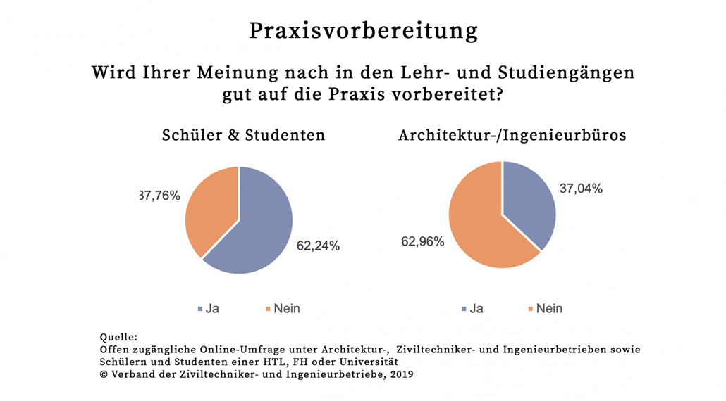 Zudem sind rund zwei Drittel der Schüler und Studenten der Meinung, ihre Ausbildung bereite sie gut auf die Praxis vor, während rund zwei Drittel der Befragten seitens der Architektur- und Ingenieurbüros der gegenteiligen Meinung sind.