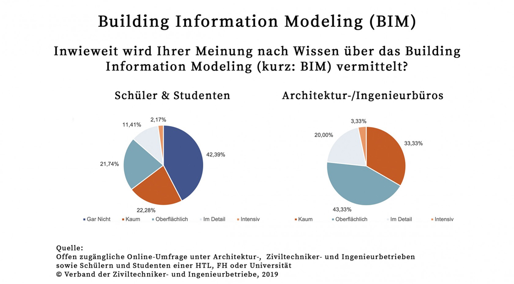 Hinsichtlich der Vermittlung von BIM wird jedoch sowohl von Studierenden und Schülern als auch von Architektur- und Ingenieurbüros Kritik geäußert. Für circa 86 Prozent der Auszubildenden wird BIM entweder „gar nicht“, „kaum“ oder nur „oberflächlich“ in den Lehr- und Studiengängen vermittelt und in etwa 76 Prozent aller befragten Unternehmen sind der Meinung, dass in Bezug auf die Vermittlung von Kompetenzen rund um das Thema BIM starker Aufholbedarf besteht.
