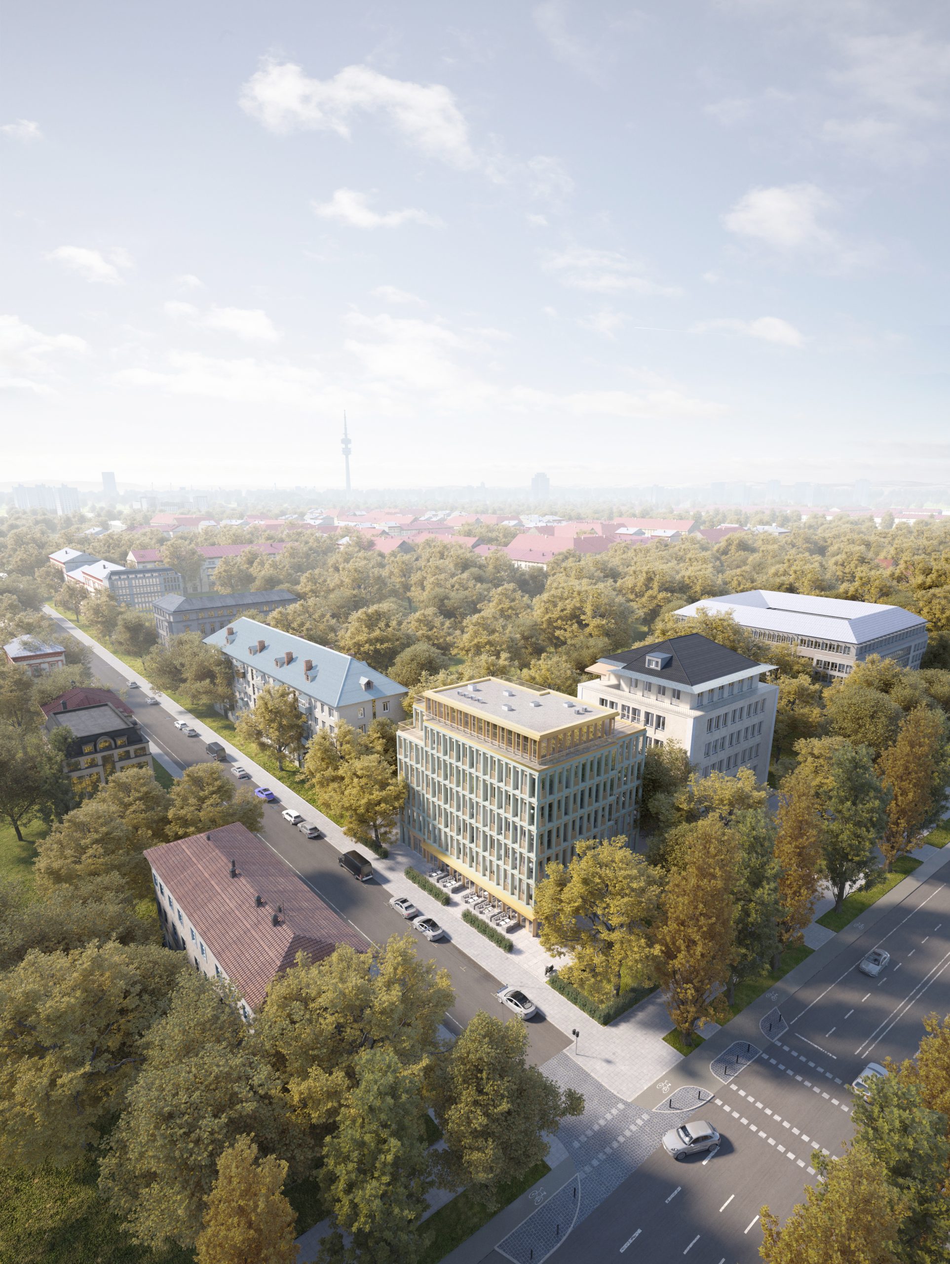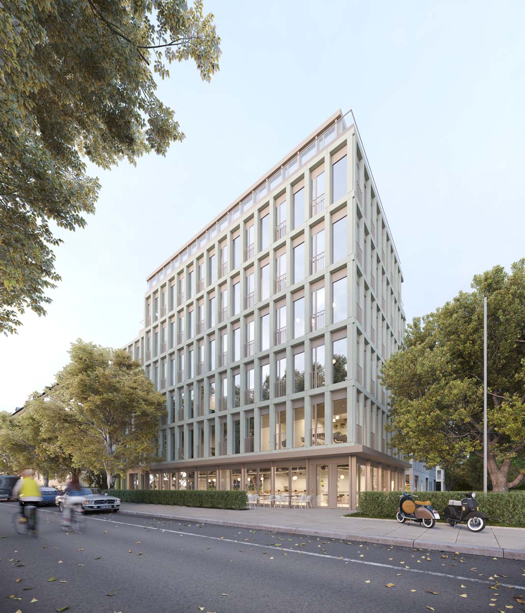 Eine gänzlich aufwertende Architektursprache vermittelt die neue Fassadengestaltung im Vergleich zur Schwere der massiven horizontalen Bänder des Bestands. Sie weicht einer vorgehängten Konstruktion aus vertikalen und horizontalen Lisenen, deren fein strukturierte und leicht grüngetönte Fassadenbeton-Elemente eine zeitgemäße, wertige und solide Ausstrahlung haben. Betont durch ein Vordach öffnet sich die Fassade im Erdgeschoss mit dem Restaurant zwischen Leopold- und Georgenstraße. Für Anrainer:innen und Passant:innen schafft diese Transformation des Bestandsgebäudes ein neues Erlebnis: Die moderne Architektur verleiht der Leopoldstraße als Flaniermeile eine feinsinnige Modernität. Auch die Begrünung leistet einen wertvollen Beitrag. Die Pappeln im Osten des Gebäudes bleiben nach dem neuen Planungskonzept von CSMM vollständig erhalten. Sie spenden dem zukünftig vergrößerten Freibereich der Gastronomie nicht nur ausreichend Schatten, sie halten auch die Luft an der vielbefahrenen Leopoldstraße rein und regulieren hohe Temperaturen im Sommer. Mindestens 26 Fahrrad-Stellplätze stehen den Mitarbeitenden der Büros und den Gästen des Restaurants zur Verfügung.