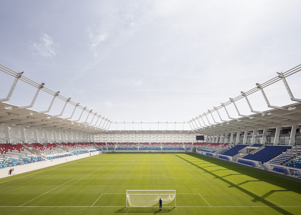 Mit rund 9900 Sitzplätzen ist das neue Stadion im globalen Vergleich eher klein dimensioniert. Die spezifische Zielsetzung bestand daher darin, auch in diesem Maßstab die Atmosphäre einer Fußballarena zu ermöglichen und darüber hinaus eine deutliche Präsenz im Stadtraum zu erzielen. Dazu wurden eine umlaufend einheitliche Fassadenstruktur und ein einfaches und gleichwohl volumenbildendes Tragwerk entwickelt. Das rautenförmige Faltwerk der Fassade aus Metallkassetten führt die gesamte Kubatur zu einem homogenen Baukörper zusammen. Darüber hinaus markiert, in zweiter Ebene, der sich hoch über dem Gebäude abzeichnende Kranz der Leuchtenmasten die Dimensionen des Spielfelds nach außen. Für Stadionbesucher:innen wie aus der Perspektive der Vorbeifahrenden entsteht damit an diesem exponierten Standort eine dynamische und plastische Erscheinung. Besonders entfaltet sich diese Wirkung bei Dunkelheit, wenn Spielfeldbeleuchtung und illuminierte Fassadenstruktur weit in den Stadtraum hinein ausstrahlen.