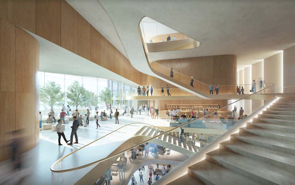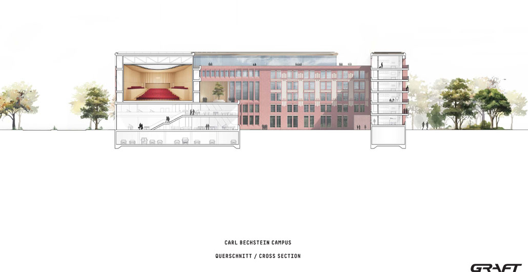 Im Zentrum des umfangreichen Bauvorhabens stehen Räumlichkeiten für die Ausstellung und Präsentation der weltweit bekannten Klaviere und Flügel des Unternehmens sowie zwei öffentliche Musiksäle für Aufführungen der gesamten Bandbreite des Klavier-Repertoires. Der große Klavier-Kammermusiksaal im Carl Bechstein Campus wird ein wertvoller Baustein der Berliner Kulturlandschaft werden. Der Saal für 500 Gäste stellt mit seiner frontalen Ausrichtung eine perfekte Ergänzung zu den zentral organisierten Berliner Kammermusiksälen der Philharmonie und des Pierre-Boulez-Saales dar. Sein Klang und die bautechnische Konstruktion sind in enger Zusammenarbeit mit den Ingenieuren von ARUP und insbesondere ihrem renommierten Konzertsaal-Akustiker Tateo Nakajima entwickelt worden. Ein kleinerer Saal für etwa 100 Zuhörer vervollständigt das Programm. Der Zugang zu den beiden Sälen erfolgt über ein spektakuläres Foyer und Treppenhaus, das sich über mehrere Geschosse entlang der Fassade entwickelt und die Besucher mit einer großen Geste empfängt.