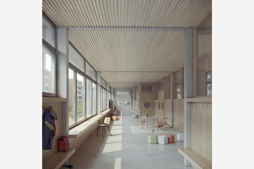 Das umfassende Raumprogramm findet beim Siegerprojekt effizient organisiert in einem schmalen Längsbau Platz. Sämtliche Klassenzimmer (12 Sekundarschulklassen, drei Primarschulklassen, vier Klassen SEK3 – Oberstufe für Gehörlose und Schwerhörige – sowie drei Klassen für die Heilpädagogische Schule oder die Regelschule) sind in Cluster organisiert und befinden sich in den Obergeschossen. Die abwechslungsreich gestalteten Korridore dienen als Lärmpuffer zur Strasse und sind vielfältig als Garderoben, Pausenbereiche oder für Gruppenarbeiten nutzbar. Das grosszügige attraktive Schulhausdach dient wie bereits bei der Schulanlage Allmend der Gemeinschaft der Schulkinder. Dort sind die Schulküche, der Aufenthalts- und Verpflegungsraum sowie der Mehrzwecksaal vorgesehen. Daneben befinden sich zwei Allwetterplätze und ein Schulgarten, die durch die Lage auf dem Dach genügend vom Strassenlärm abgeschirmt sind. Die drei Einfachsporthallen sowie eine Schulschwimmanlage sind halb unterirdisch angeordnet und profitieren so vom Tageslicht. Sie sind, wie auch die Aussenräume auf dem Dach, separat zugänglich und können in der unterrichtsfreien Zeit auch von Vereinen oder der Quartierbevölkerung genutzt werden.