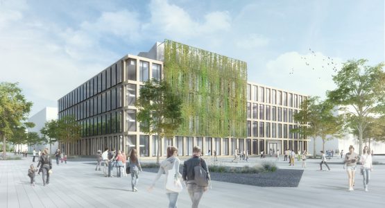 ur Förderung der Biodiversität werden Teile der Fassade begrünt. © Hammeskrause Architekten bda
