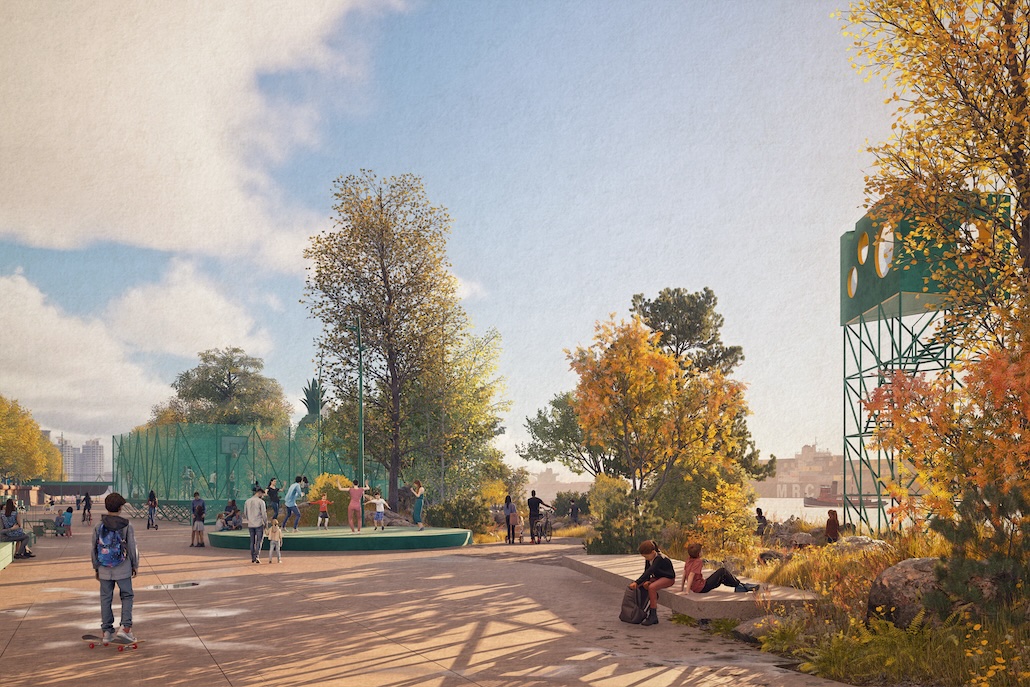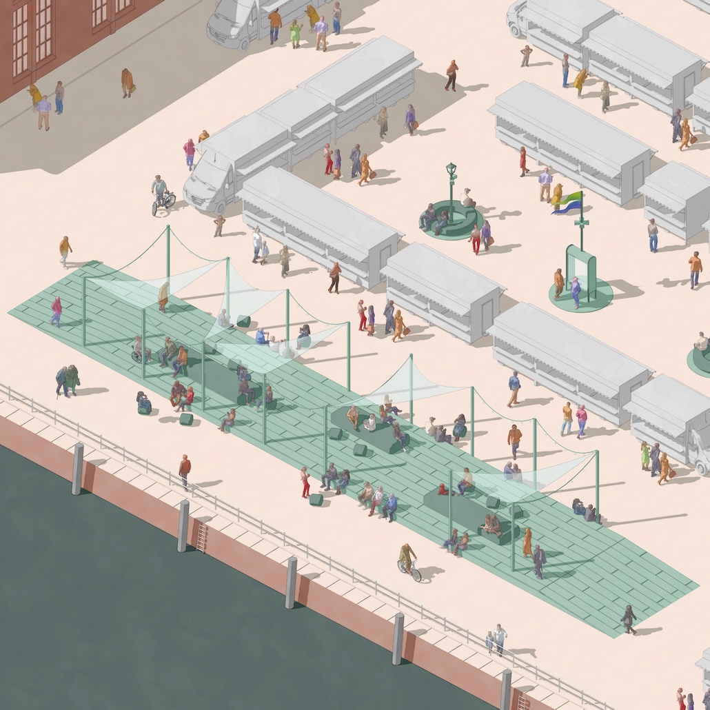 Das Konzept setzt auf Begrünung und eine bisher nicht dagewesene Nähe zum Wasser. Zahlreiche neue Bäume sollen künftig Schatten spenden und die Aufenthaltsqualität direkt am Wasser steigern. Für Kinder und Jugendliche entstehen vielfältige Angebote: Geplant sind unter anderem Skate-Elemente, ein Basketballplatz sowie offene Flächen für Fußball und Bewegung. Gleichzeitig meistert der Entwurf den schwierigen Spagat der Nutzungswünsche: Der notwendige Hochwasserschutz wird gestalterisch integriert und traditionsreiche Großveranstaltungen wie der Fischmarkt oder der Hafengeburtstag finden auch im neuen „Grünen Ding“ ihren festen Platz.