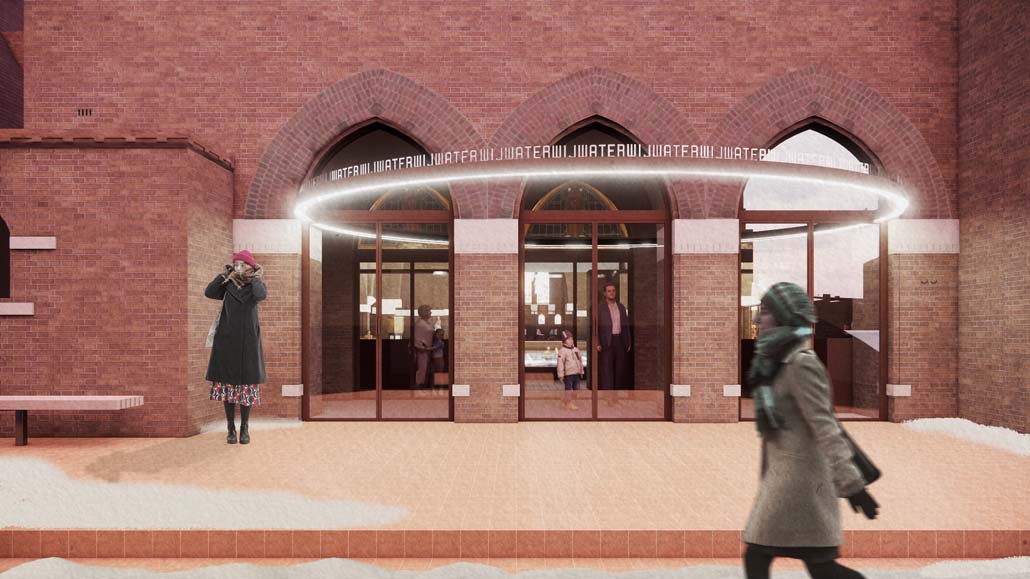 Im Eingangsbereich wird ein beleuchtetes, kreisförmiges Vordach als zeitgemäßes Element eingeführt, das zugleich auf die Vergangenheit des Ortes verweist. Im Inneren führen die Wege durch die Kirchenschiffe zu Umkleiden und Gastronomie, die im rückwärtigen Bereich liegen. Die zentrale Schwimmhalle ist durch Glaswände klimatisch getrennt; diese enthalten Elemente der früheren Kirchenausstattung: Die alten Kirchenbänke werden in die Glaswände integriert und dienen auf einer Seite als Sitzmöbel für Schwimmer:innen, auf der anderen Seite als Bartresen für Zuschauer:innen. Auch der ehemalige Kanzelbereich erhält eine neue Nutzung – als Sitz für die Badeaufsicht.