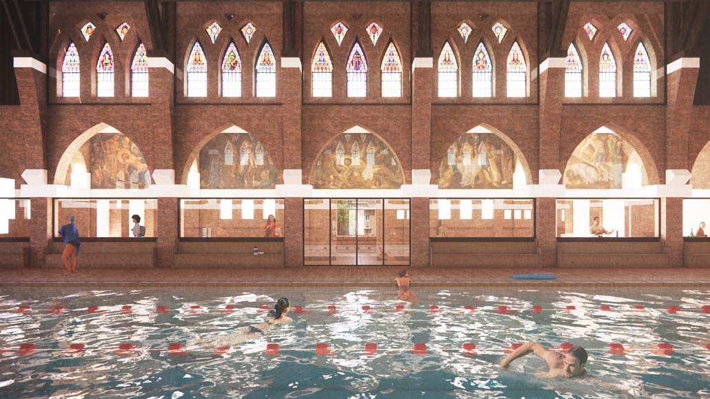 „Die Zahl leerstehender Kirchen steigt, deshalb brauchen wir kreative Ideen für eine neue Nutzung“, so Winy Maas, Gründungspartner von MVRDV. „Warum sollten diese Gebäude nicht wieder eine soziale Funktion erhalten – wie früher? Ein öffentliches Schwimmbad eignet sich dafür hervorragend.“