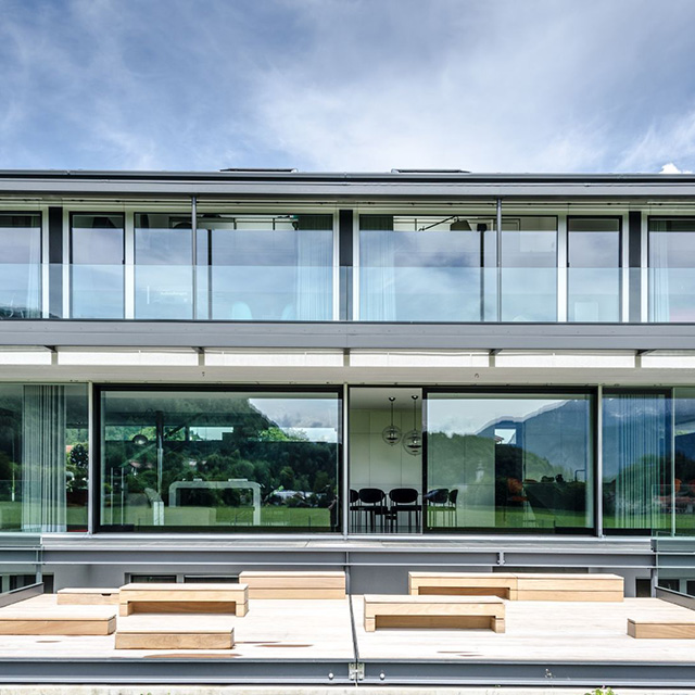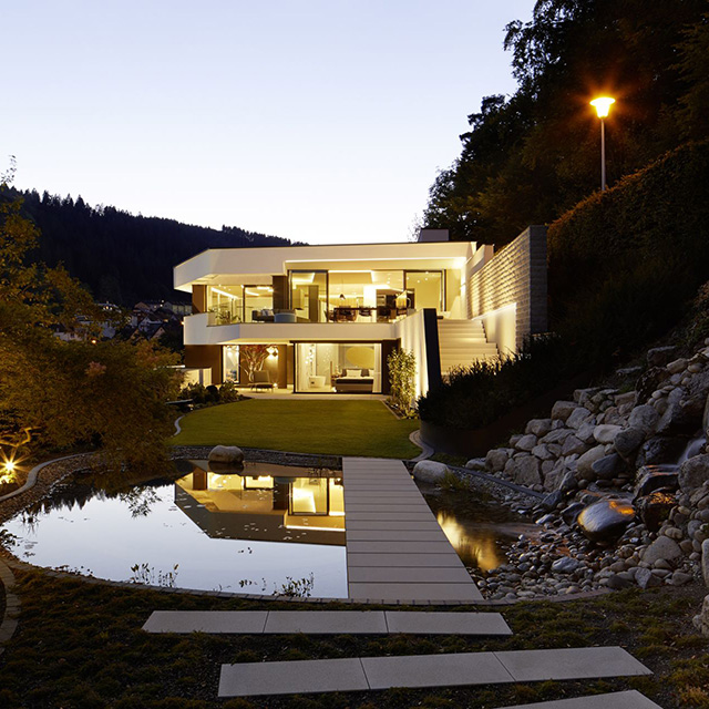 Die Topografie des Grundstücks am Hang ist extrem: im Norden durch die Straße und den steil ansteigenden Wald eingefasst, fällt das Gelände nach Süden ebenfalls stark ab. Hier bildet sich ein künstlich geschaffenes schmales, aber langes Plateau, das sich von Westen nach Osten erstreckt. Das neue Haus nimmt die virtuellen Höhenlinien des Ortes auf und abstrahiert diese, indem es die Fassaden der drei Geschosse Richtung Ausblick polygonal übereinanderlegt. Das Gebäude zeigt sich auf der Eingangsseite zur Straße hin geschlossen. Erst nach Passieren des Gartentors, das sich aus der homogenen Verkleidung der Garagentore entwickelt, beginnt sich das Gebäude für die Bewohner und für Besucher sukzessive zu öffnen. Es gelingt vom teilweise überdachten Eingangshof ein erster Blick von außen in die Küche und von dort zur vorgelagerten Terrasse auf der Südostseite. In dem hellen Hof wird man von einem perforierten, lichtdurchlässigen Stahlfilter mit scheinbar textiler Oberfläche empfangen, durch den man über die dort integrierte Haustür in das Innere des Wohnraums gelangt. Hier in der obersten Etage öffnet sich der Blick über den Wohnraum, den Essbereich und die Küche mit Kamin in das Tal.