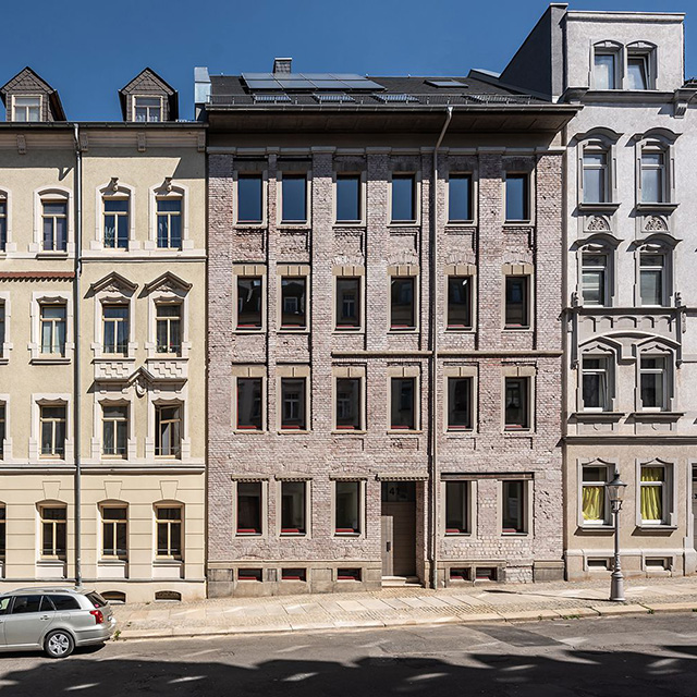Im Jahr 1980 erschien der erste Band der Reihe „Das Berliner Mietshaus (1740–1989)“ der Architekturhistoriker Jonas Geist und Klaus Klüvers. Es ist keine Übertreibung zu behaupten, dass es dieser wissenschaftlichen Untersuchung zu verdanken ist, dass dieser Bautyp des 19. Jahrhunderts gegen die Anfeindungen der klassischen Moderne rehabilitiert werden konnte. Heute, noch einmal 40 Jahre später, beweisen uns die Architektin Annette Fest und der Architekt Christian Bodensteiner, wie zeitlos, universell und richtungweisend dieser Bautyp auch heute noch ist. Ihre einfache wie radikale Idee besteht darin, ein solch typisches Mietshaus in der Chemnitzer Gießerstraße von der nach Jahren der Vernachlässigung maroden Putzverkleidung zu befreien. Gewissermaßen „Stripped to the Bones” wird die faszinierende typologische Einfachheit und Klarheit des Gebäudes plötzlich wieder für unsere heutigen Augen lebendig. Die neue Fassung, bestehend aus einer hellen, transparenten Lasur des Ziegelmauerwerks, öffnet die Augen für die Würde dieses bald 300 Jahre alten Bautyps. Auch bezogen auf die Grundrisse der Wohnungen erweist sich in der Neudefinition durch bodensteiner fest einmal mehr die unglaubliche Wandlungsfähigkeit und universelle Brauchbarkeit dieses Typs. Die Arbeit der Architekten besteht im Grunde lediglich darin, die wenigen Elemente dieses Bautyps in ihrer Wirkung und Funktion zu bestätigen: Die straßenseitige Fassade mit ihrer neuen Fassung, die tragende Mittelwand, welche hier die offenen „Bricklofts“ der Straßenseite von den verputzten Räumen der Hofseite trennt. Das faszinierende Treppenhaus, dessen Handwerkskunst durch den Verzicht auf eine Putzfassung sichtbar wird, und schließlich die Hoffassade, welche sich, wie immer bei diesem Bautyp, ganz der Funktion unterordnet: in diesem Fall einem energetisch anspruchsvollen Gesamtkonzept.