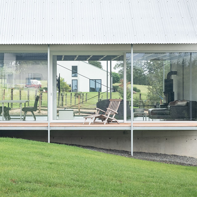 In seiner Typologie folgt der Neubau dem traditionellen einraumtiefen Langhaus. Die Haupträume nehmen die gesamte Breite ein und reihen sich längs aneinander. Die Enden des Hauses sind unterschiedlichen Funktionen zugeordnet: Wohnbereich im Süden, Garage und Abstellräume im Norden. Für Oberberg typisch, hebt ein massiver Sockel, hier aus Stahlbeton, die Wohnräume zum Schutz gegen die Witterung leicht über das gewachsene Hanggelände. Das Spiel aus Licht und Schatten belebt die Dachhaut aus fein strukturiertem Wellblech und erzeugt eine weiche Fläche als gestalterisches Bindeglied zwischen Weidelandschaft und Himmel. Der Wohnraum in Gebäudemitte reicht bis unter das Dach und bildet den zentralen Gemeinschaftsraum, von dem aus im Obergeschoss Schlafräume und Bad der Kinder und das Elternschlafzimmer mit Bad erschlossen werden. Ein Stahlsteg mit lichtdurchlässigem Gitterrost verbindet die beiden voneinander getrennten Bereiche und mündet in der gemeinsamen Galerie im zweigeschossigen Wohnraum. Es entsteht eine Architektur, die sich auf das Notwendige beschränkt, um das Bestmögliche zu erreichen.