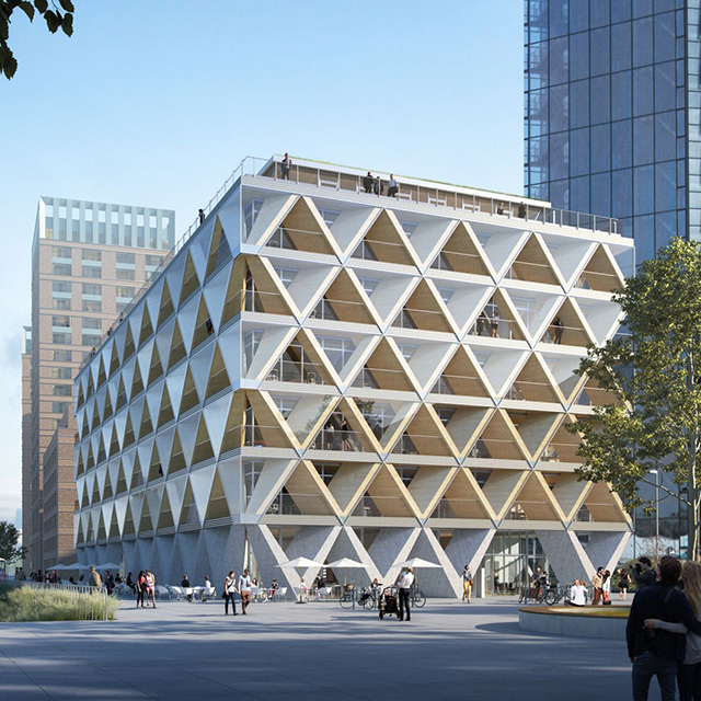 Städtebaulich handelt es sich bei diesem Projekt um einen einfachen und klaren kubischen Baukörper. Der Neubau positioniert sich als kraftvoller Solitär am Hafen, eine nachvollziehbare Reminiszenz an den Typus von Pack- oder Lagerhäusern, die traditionell das Bild von Hafenbebauungen prägen. Anstelle geschlossener Fronten historischer Lagerhäuser sind die Fassaden des Neubaus von einem raumhaltigen Fassadengerüst aus markanten Tetraedern geprägt. Die sehr tiefe Fassade scheint zugleich ein System aus Loggien und feststehendem Sonnenschutz zu sein. Sie erzeugt eine prägnante Plastizität, die gerade mit der einfachen Grundform des Volumens komplementär harmoniert. Die charakteristischen Holzstrukturen bringen eine neue Materialität in den Hafen. Sie sind gestalterischer Ausdruck des zentralen Nachhaltigkeitskonzepts, das den eigentlichen Mittelpunkt des Gesamtentwurfs ausmacht.