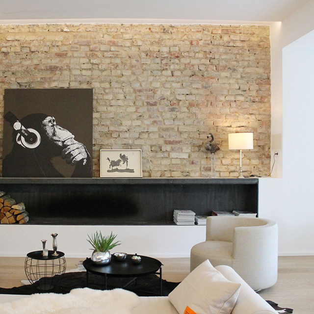 des Dreifamilienhauses aus dem Jahr 1925. Dabei war es ein Spagat zwischen der Erhaltung der historisch wertvollen Bausubstanz und dem Wunsch nach einem zeitgemäßen, offenen Wohngefühl. Somit wurde das Haus vertikal so gegliedert, dass die Privatheit nach oben hin zunimmt. Im Erdgeschoss befinden sich der offene und „öffentliche“ Bereich mit Wohn- und Esszimmer, im ersten Obergeschoss das Eltern- und Kinderschlafzimmer und in der Ebene darüber der private Arbeitsbereich mit einem angegliederten Gästezimmer und letztlich im Speicher ein zusätzliches Spielzimmer. Um die möglichst durchgehende Offenheit des Wohnbereichs im Erdgeschoss zu erreichen, wurde die Erdgeschossebene vollständig entkernt und der Raum mit einem Anbau zum Garten hin erweitert. Dabei fließen die Nutzungen und Funktionen der einzelnen Bereiche ineinander über und schaffen einen offenen Kommunikationsraum mit einem vier Meter breiten Schwarzstahlkamin im Mittelpunkt. Bei der Wand darüber wurden die alten Ziegel im Reichsformat freigelegt und so ein warmer, gemütlicher Eindruck mit vorhandenen Strukturen geschaffen.