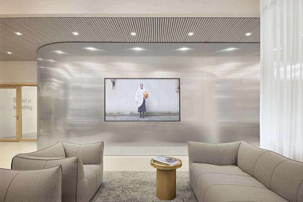 Ein warmes Grau an den Wänden bildet zusammen mit sichtbar gelassenen Betondecken und hellgrauen fugenlosen Böden einen neutralen Hintergrund. Das Gebäude wird so zum physischen Äquivalent der digitalen Markenidentität. Reflektierende und spiegelnde Oberflächen, die den Raum visuell erweitern, und großzügig eingesetzte Textilien nehmen Bezug auf die Modewelt.