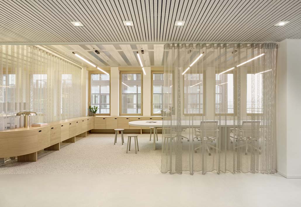 Die Büroflächen in den oberen Etagen sind in unterschiedliche Zonen gegliedert – von kommunikativen Co-Working-Bereichen bis zu kontemplativen Think-tank-Räumen. Raumhohe Vorhänge erlauben eine flexible, noch kleinteiligere Zonierung. Die verschiedenen Bereiche sind bewusst platziert: die offeneren Bereiche zur lebhaften Innenstadt hin, Räume für konzentriertes Arbeiten an der ruhigeren Gebäudeseite.