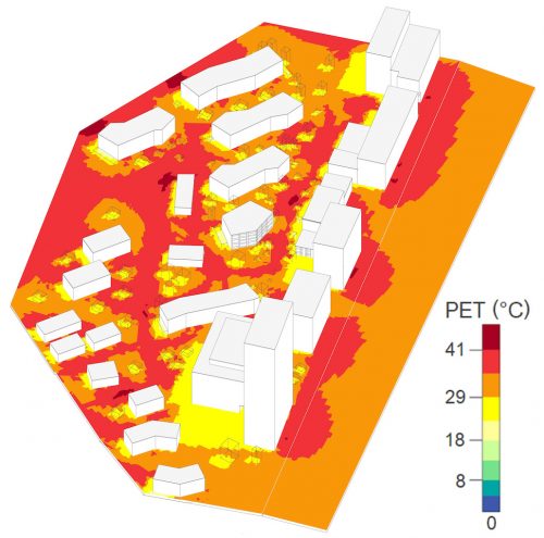 rechnenden Algorithmen», begründet Koschenz den frappanten Unterschied in der Berechnungsgeschwindigkeit. So dauert es Sekunden oder höchstens wenige Minuten, bis die Auswirkungen einer Änderung berechnet sind. Das Tool könne ab dem ersten Schritt im Planungsprozess durch die Planenden selbst eingesetzt werden. Man kann damit zum Beispiel mit wenig Aufwand zwei Varianten der Fassadengestaltung oder der Bepflanzung mit Bäumen in einem Innenhof vergleichen. Und dies nicht nur für einen Sommertag, sondern für eine ganze Sommerperiode.