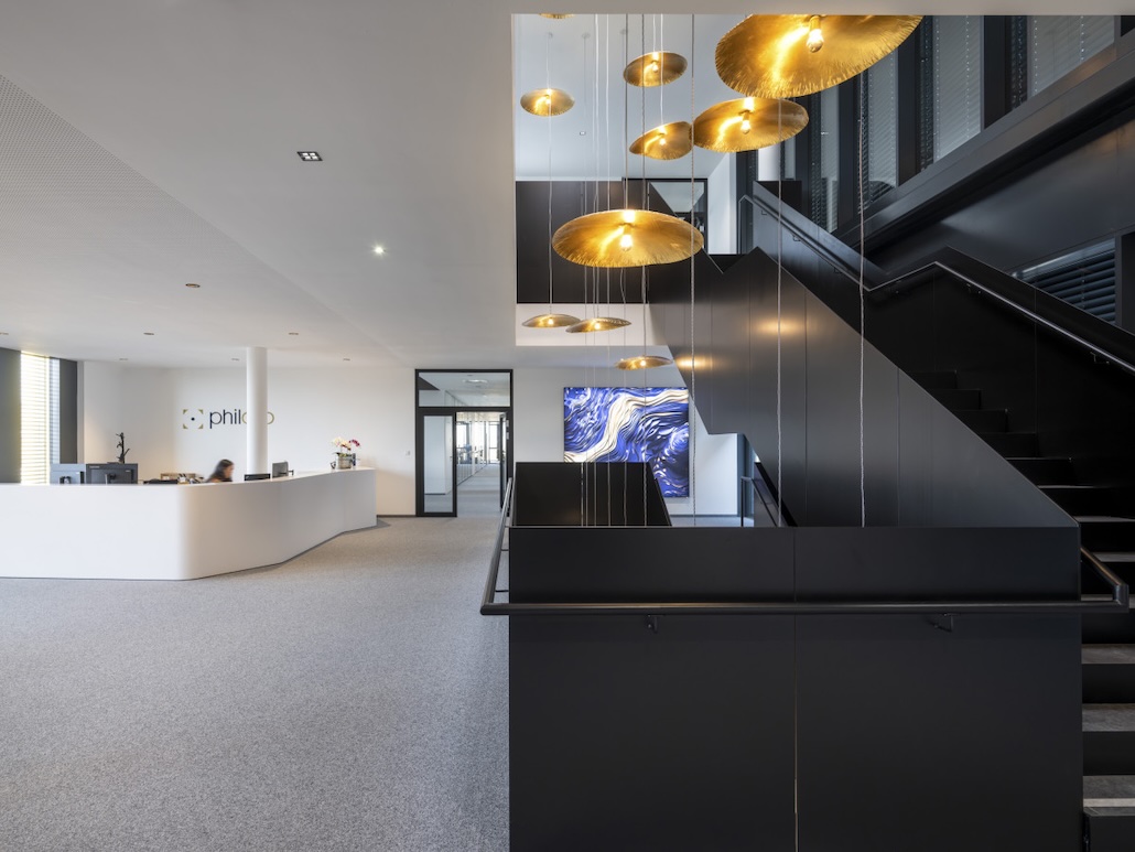 Als neues Headquarter übernimmt das Verwaltungsgebäude eine prägende Rolle am Standort. Die Fassade drückt Seriosität, Transparenz und Eleganz aus. Markantestes Gestaltungselement sind die goldfarbenen Lamellen, wodurch die Fassade zum „schwebenden Goldbarren“ wird – und damit die Corporate Identity von philoro architektonisch sichtbar macht.
