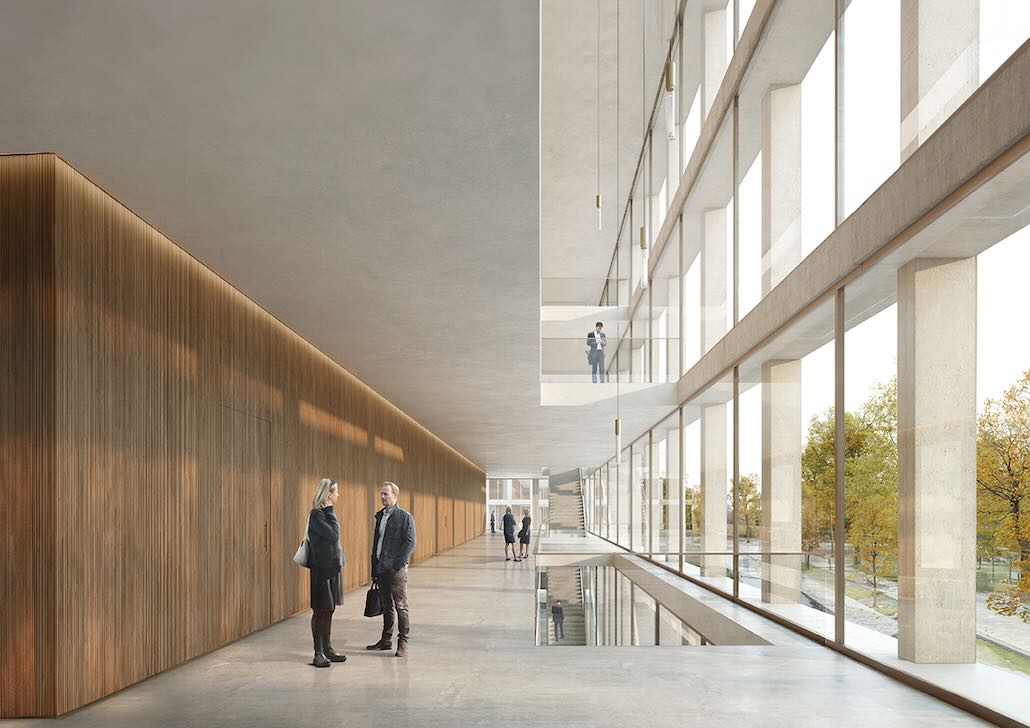 Der städtebauliche Entwurf von HPP überraschte 2022 mit einem Konzept ohne Hochhaus. Die architektonische Ausarbeitung baut darauf auf und konzentriert sich auf die Vorteile einer horizontalen Nutzungsverteilung in fünf leicht gegeneinander versetzten Gebäudekuben. Das neue Justizzentrum, das als größtes Justizzentrum des Landes NRW gilt, entsteht direkt an der Luxemburger Straße auf einer Fläche von rund 127.000 Quadratmetern. Durch eine Höhenstaffelung von fünf bis sieben Geschossen fügt sich der Entwurf sensibel und maßstäblich in das heterogene städtebauliche Umfeld ein. Auch der angrenzende Freiraum wurde neu konzipiert: als harmonisches Bindeglied zwischen der südlichen Stadtstruktur und dem nördlichen Inneren Grüngürtel. Die horizontale Organisationsstruktur bietet eine vielfältige und räumlich hochwertige Vernetzung der unterschiedlichen Funktions- und Arbeitsbereiche und schafft alle Voraussetzungen moderner Arbeitswelten mit New Work-Flächen sowie Räumen für informelle Kommunikation. Das bestehende und 1981 eröffnete Justizhochhaus für das Amts- und Landgericht Köln entspricht heute weder den funktionalen Anforderungen an ein Justizgebäude, noch ist die bauliche Substanz für einen weiteren Erhalt geeignet.