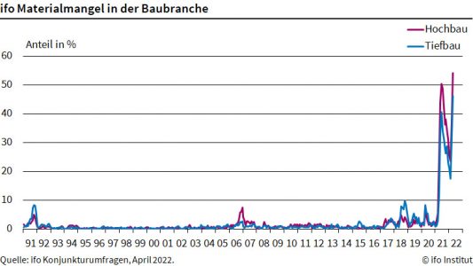 München (pm) – Die Materialengpässe auf dem Bau haben sich nochmals deutlich verschärft. Gleichzeitig haben sich die Erwartungen in der Branche dramatisch verschlechtert. Das geht aus den Umfragen des ifo Instituts hervor. Im Hochbau zeigten sich im April 54,2 Prozent der Betriebe von Lieferengpässen betroffen, nach 37,2 Prozent im März, beim Tiefbau 46,2 Prozent, nach noch 31,5 Prozent. „Das sind Höchststände seit Beginn der Zeitreihe 1991“, sagt ifo-Forscher Felix Leiss. Auch die Geschäftserwartungen haben sich verdunkelt. Im Hochbau notierten sie bei minus 46,9 Punkten, das ist ebenfalls der tiefste Stand seit 1991. Im Tiefbau waren es sogar minus 48,6 Punkte.