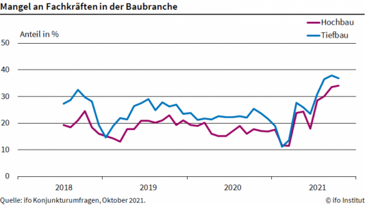 München (pm) – Der Fachkräftemangel im Hochbau hat sich verstärkt. Das geht aus einer Umfrage des ifo Instituts hervor. In der Branche meldeten im Oktober 34,1 Prozent der Unternehmen einen Mangel an Fachkräften, nach 33,5 Prozent im Vormonat. Im Tiefbau ging die Zahl zurück auf 36,8 Prozent, nach 37,9 Prozent im Vormonat.