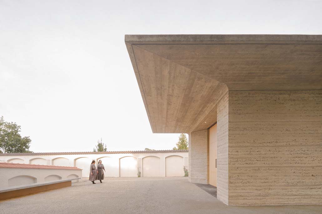 Bei dieser Einreichung wird die handwerklich sehr saubere Ausarbeitung der vor Ort hergestellten Stampflehmwände mit verschiedenen Farbschichten gewürdigt. Anders als üblich fungieren die circa 85 cm dicken Stampflehmwände hier als tragende Konstruktion für das massive und begrünte Betondach. Der Neubau wird als innovativer Beitrag mit hoher ästhetischer und architektonischer Qualität gesehen. Das Projekt erhält den Lehmbaupreis in der Kategorie Nicht-Wohnungsbau in Höhe von 12.000 Euro. Preisträger sind Generaloberin Maria Hanna und Claus Mellinger aus Bad Waldsee.