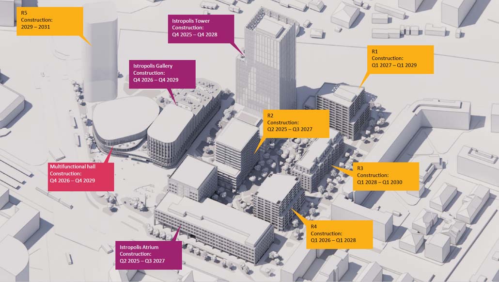 Für Istropolis liegt eine gültige Baugenehmigung vor, und der Entwickler plant den Baubeginn für den Sommer 2025. Angesichts des Umfangs des Projekts und der Größe des Geländes wird die Umsetzung in mehreren Phasen über einen längeren Zeitraum erfolgen. Gemäß den Baugenehmigungen wird zunächst mit dem Bau von zwei Bürogebäuden und einem Wohngebäude begonnen, deren Fertigstellung in etwa zweieinhalb Jahren erfolgen soll.