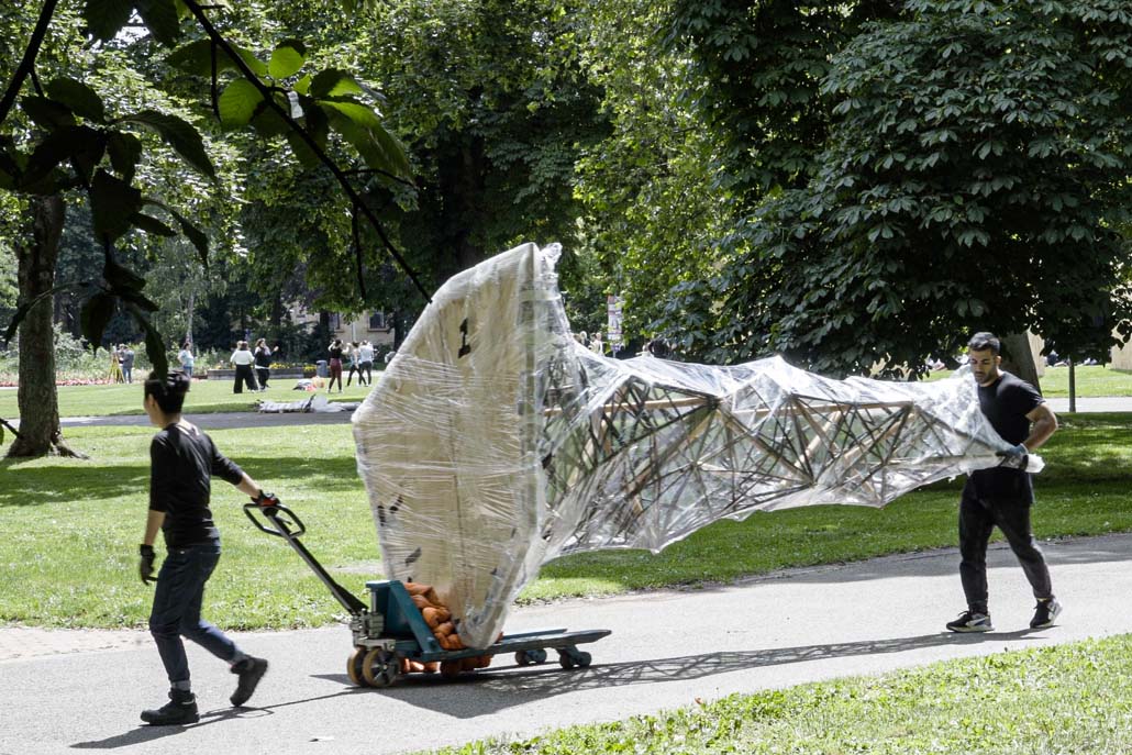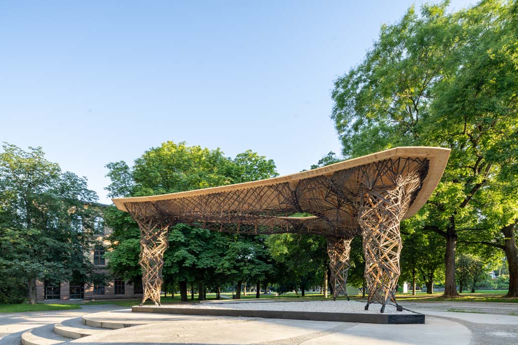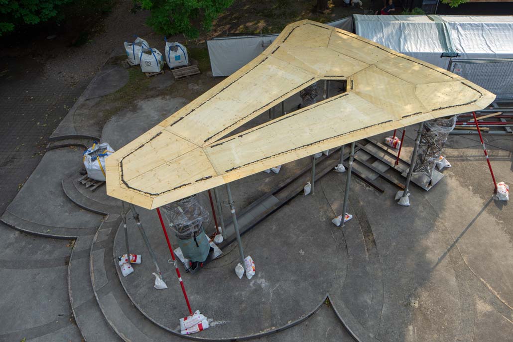 Der Entwurf des Pavillons besteht aus einer dreibeinigen Dachkonstruktion, die sowohl ein- als auch mehrfach gespannte Tragwerke durch eine stark entmaterialisierte Struktur erweitert. Die Tragfähigkeit ist so ausgelegt, dass sie das 1,5-fache ihres Eigengewichts sowie 1,5-fache Windlasten tragen kann, wobei sowohl Auftriebskräfte als auch horizontale Kräfte berücksichtigt werden.